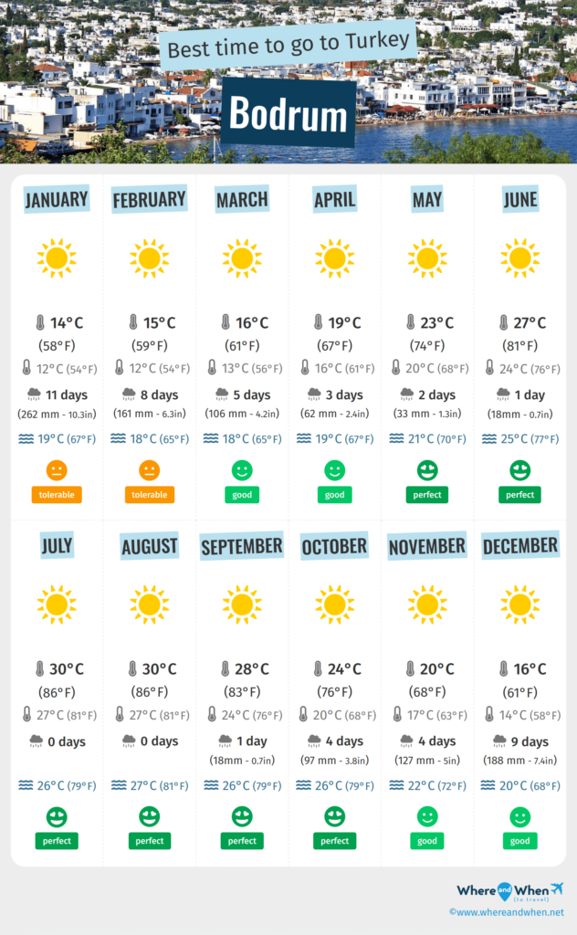 Here’s a month-by-month breakdown of average temperatures in Bodrum: